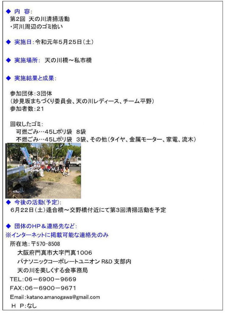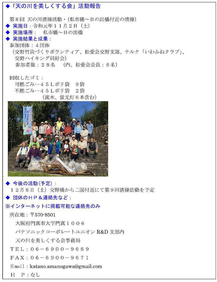2019.11.8 支部行事, 社会貢献, 行事検索連動 「天の川を美しくする会」清掃活動報告 交野支部TOPページへ 支部行事, 社会貢献, 行事検索連動 コメント: 0 11月度 会報・かたの 更新前の記事 2019年 度新会員・還暦者お祝い懇談会の開催次の記事