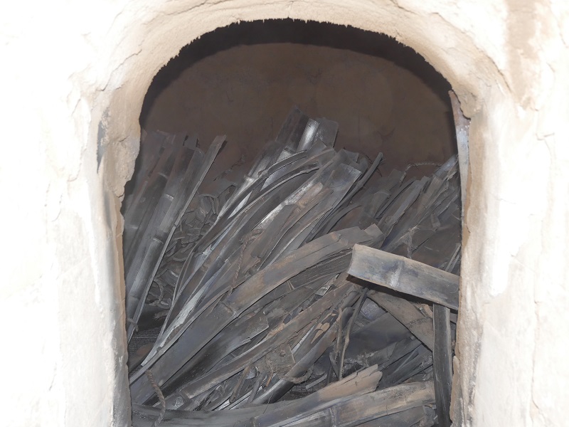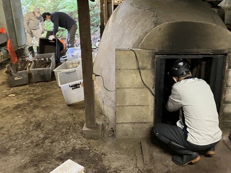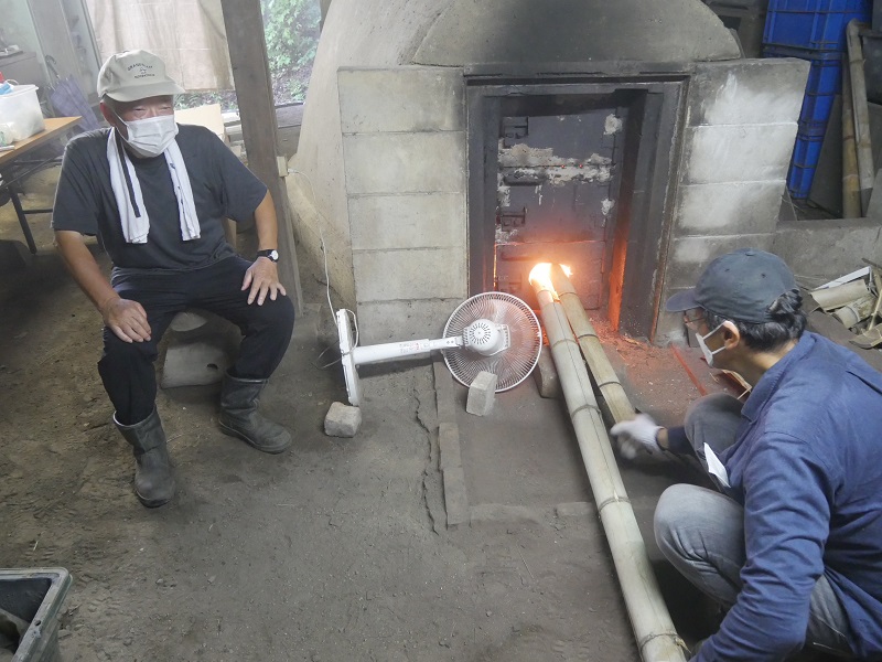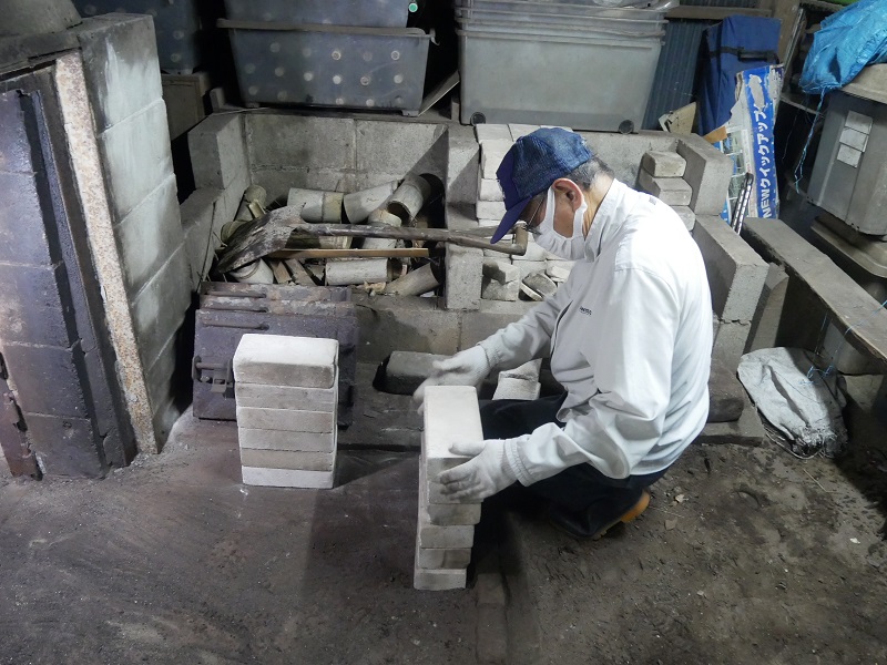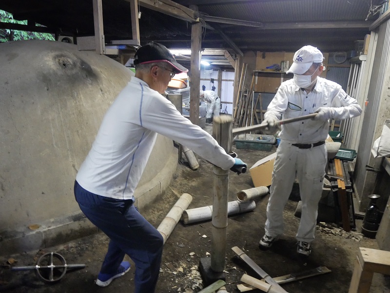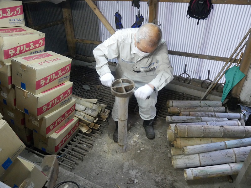ああああ・絵付けに使える竹炭の歩留まりを上げるため、竹束横置き(捻れ防止)、火力控目(ひび割れ防止)、
