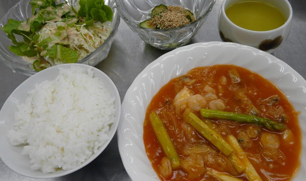 ああああ チリソース煮の準備、着々と 新玉、シーフードを炒めアスパラを入れて