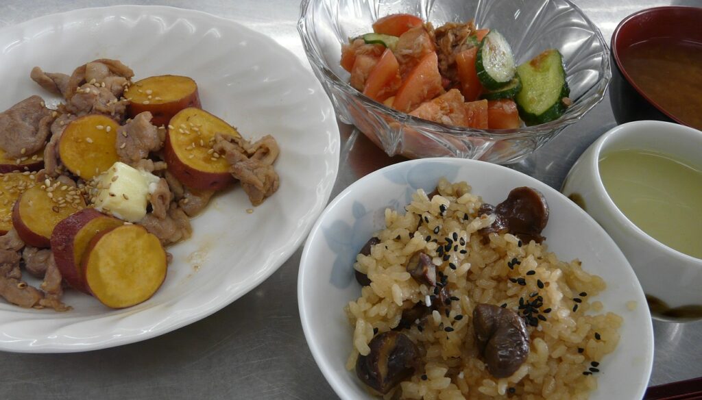 ああ〇献立 ・簡単栗ご飯、さつまいもと豚肉のバターしょうゆ炒め