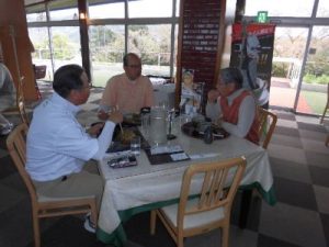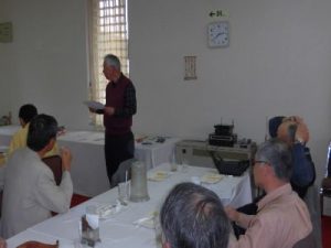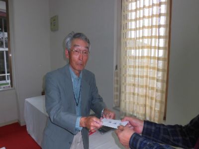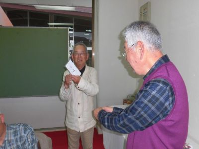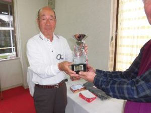 | 表 彰 式 ・橋本幹事から表彰を受ける----左から 優勝の川村会員、準優勝の中野会員、3位の妻倉会員 *妻倉会員は初参加の為3位以下に繰り下げ入賞