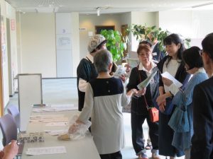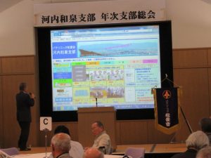 2、懇親会会場の舞台上スクリーンで、2017年度支部活動(歩こう会、施設工場見学会等)の