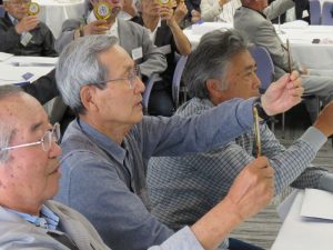 2、手鏡を持って、表情筋ストレッチを全員で体験。