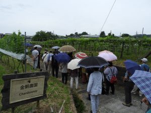 (3)まず最初に見学者用のぶどう畑へ小雨の降る中を移動。