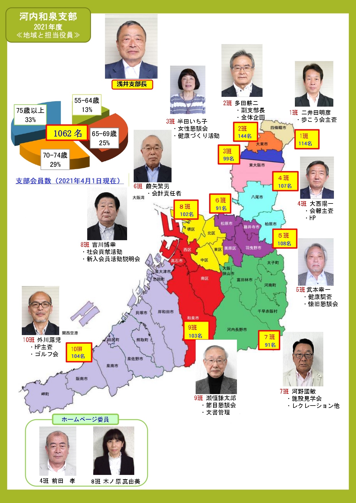 2021.06.1 お知らせ, 役員体制, 活動・情報 支部体制変更 2021年度より 従来の9班から10班体制に変更いたします。 (旧8班、9班を 新9班、新9班、10班に変更いたします) *配布資料で班色分けの誤りがありました、修正いたしました。(大阪狭山市) 投稿者: tokawa お知らせ, 役員体制, 活動・情報 コメント: 0 支部役員会 21年 5月前の記事 新年度に当たり支部長挨拶次の記事