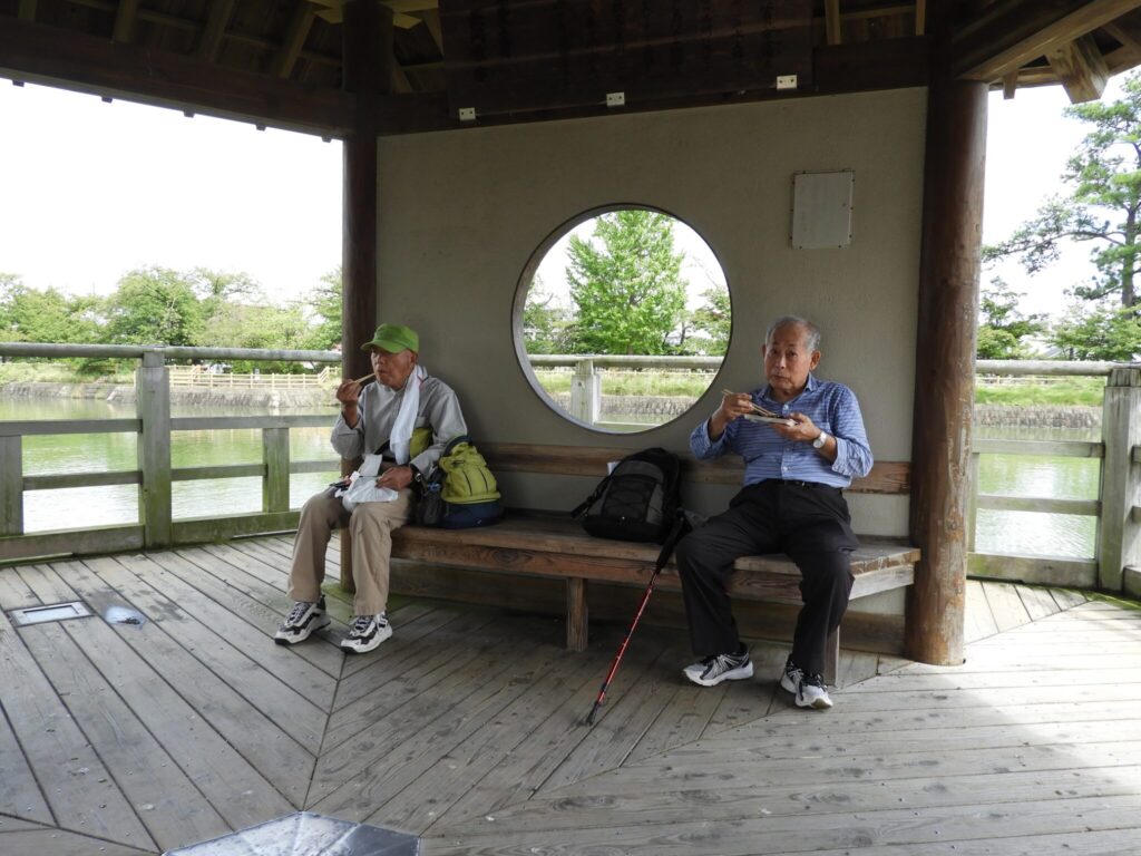 池に泳ぐ鯉や羽を休める鴨やサギを見ながらの昼食は、疲れも吹っ飛び、また天気も良くなり気持ちがスッキリ!