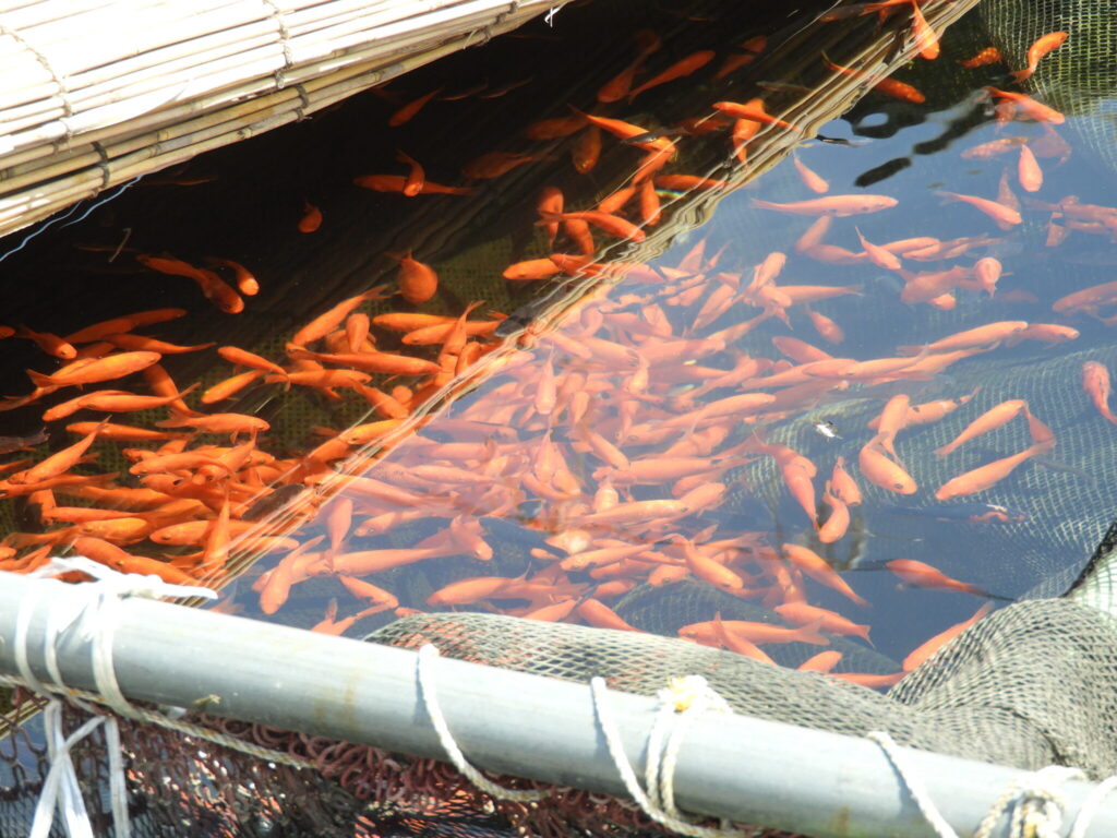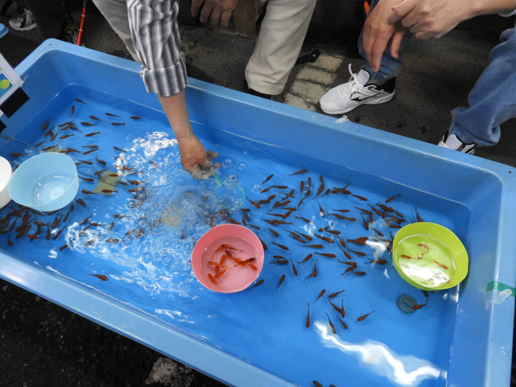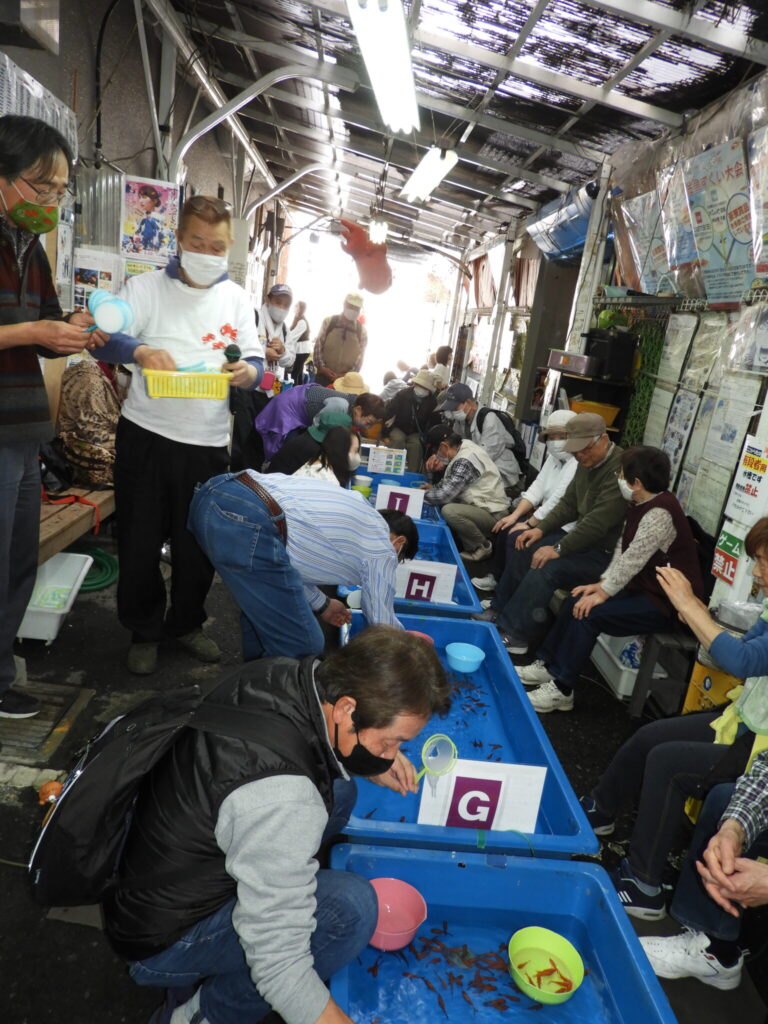 ・瀬越さんと店主の指導で、初めは遠目で見ていた皆さんが真剣に金魚を追いかけていました。