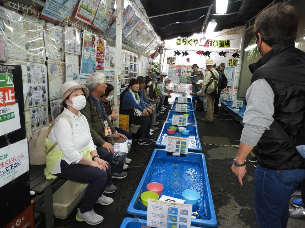 ⑤コースも後半に入り、まずは金魚すくい道場のあるみやげ処 「こちくや」 さんへ向かいました。