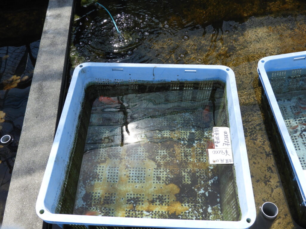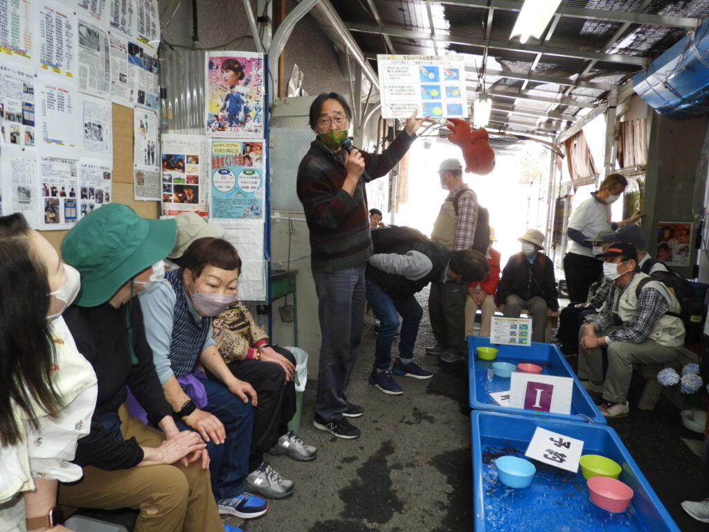 - 金魚槽を前に真剣なまなざしで説明を受ける-1
