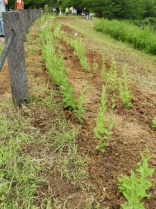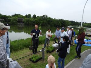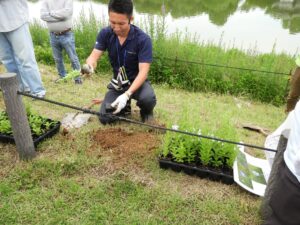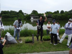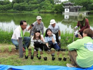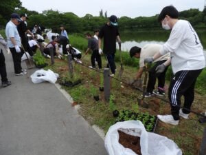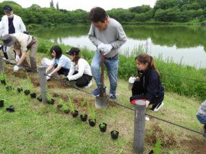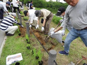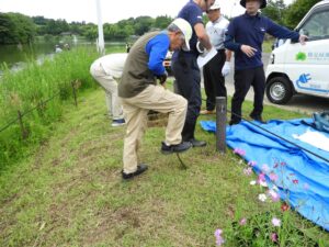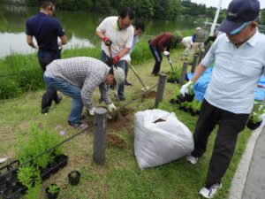 今回は花の苗(ききょう・なでしこなど)を大池の土手約50mに定植。慣れないスコップ穴掘り作業や土づくりに”いい汗”を流す!順調に作業は進み、12時前にトラブルなく作業終了。約1か月後に満開の花が来園者を楽しませてくれるでしょう!