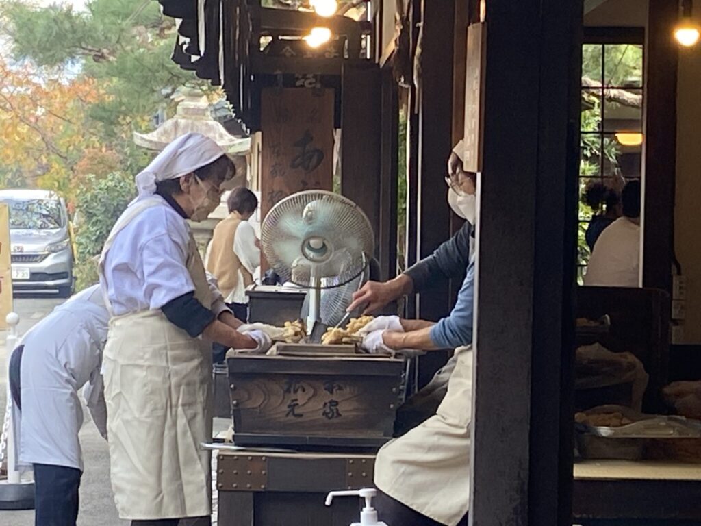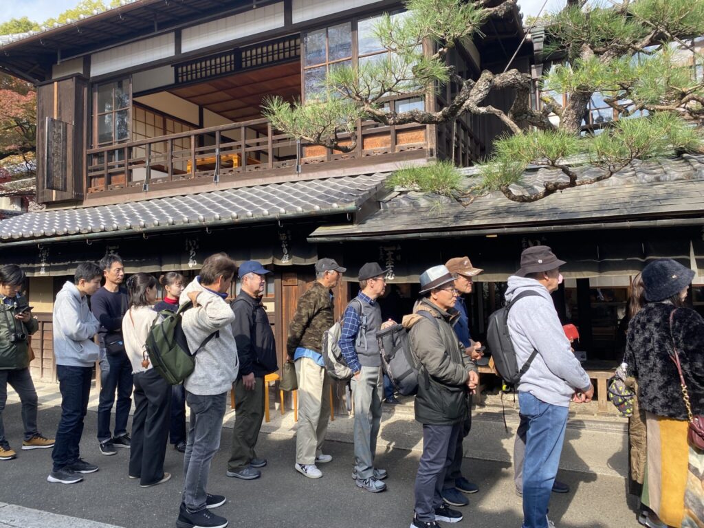 花より団子ならぬ、「紅葉よりあぶり餅」 今宮神社東参道にある2軒のあぶり餅屋は大行列。 各人好きな方は約30分以上も並びましたが、しっかりと食べる事が出来ました。これで今回の歩こう会、目的達成の声も・・・?!。コースでの概要は下記を参照下さい。