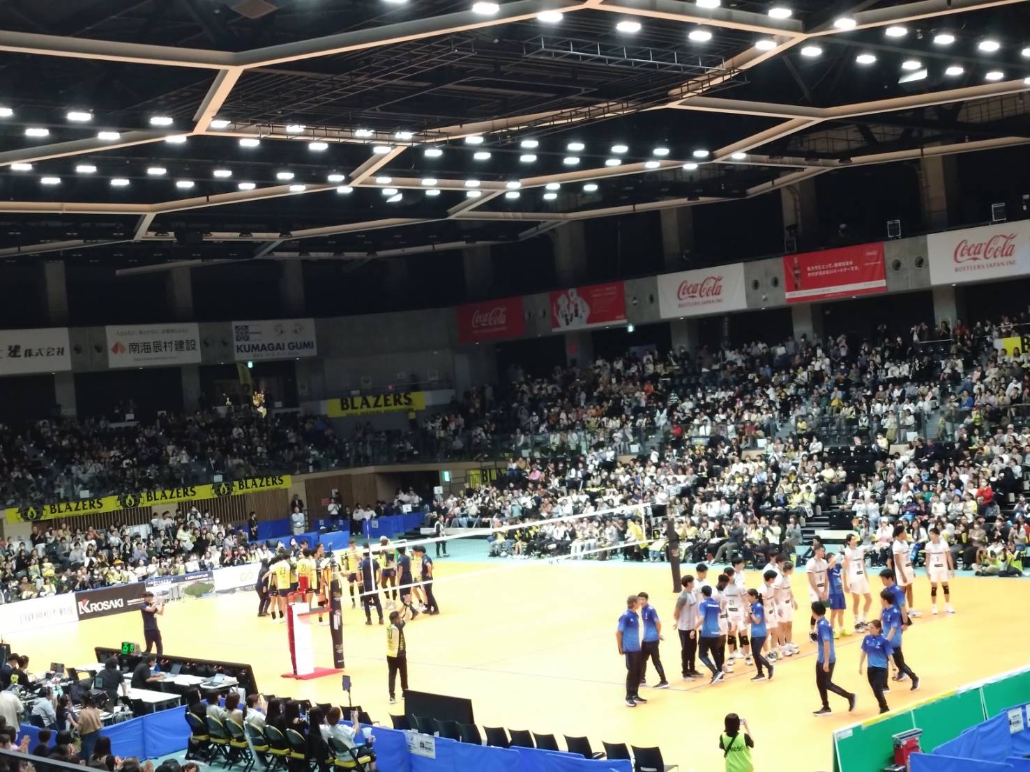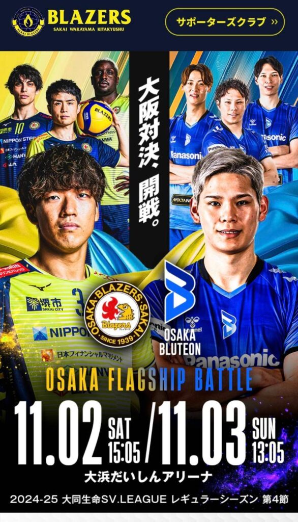 日本製鉄堺ブレイザーズ観戦チケットが当たり、観戦してきました。相手は大阪ブルテオン(旧パナソニックパンサーズ)、ブルテオンは、Blue to Eon(永遠なる青)という意志を込めて今年リブランディングされたようです。