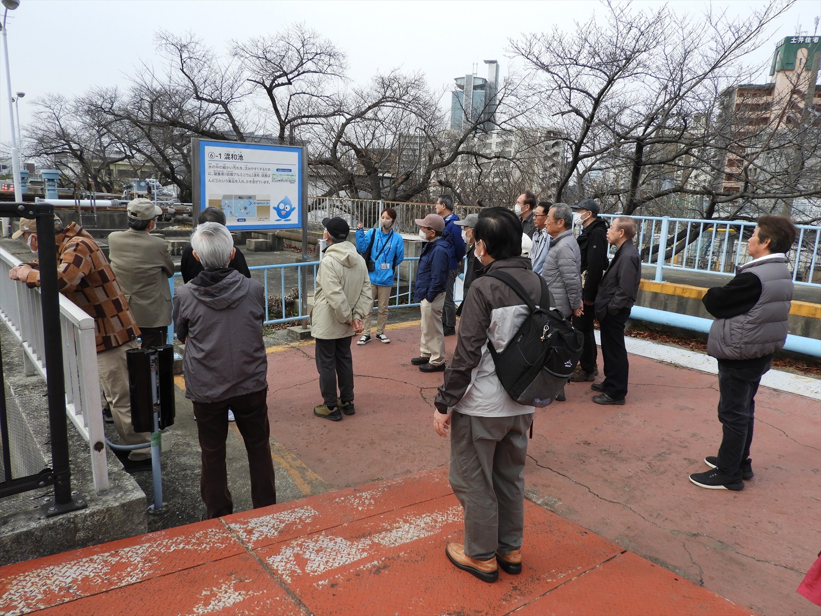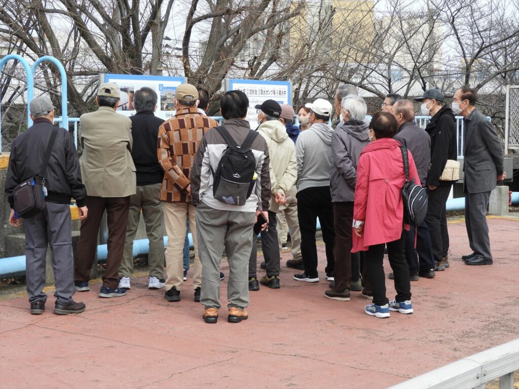 - 混和池のパネル前での説明を聞く皆さん