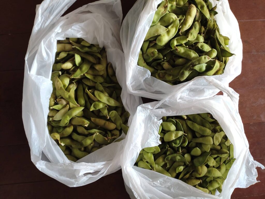 今年は雨が少なく豆にとって必要な水分が確保困難で苦労し、実入りが少ないと生産者より説明がありましたが、そのために1人3株から4株に収穫数も増えて2人で約2キロ。自分で収穫した枝豆をアテに飲むビールは最高でした。
