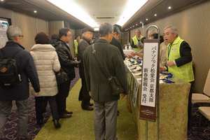 第2部は、永田支部長の年頭の挨拶に続いて、「九州歴史街道・まるごと一周」仮想ウォーク完歩者への記念品授与を行いました。68名のエントリーがあり、58名(うち、健脚コースは23名)が完歩され、最年長の山本喜代一様に代表して記念品を授与しました。会場には38名の該当者が出席されていました。続いて、森岡早苗様(ボウリング同好会会長)の乾杯で、懇親会がスタートし、暫くは新春和洋コース料理と飲み物を愉しんでいただきました。次第に宴が盛り上がって来ますと、席を移動してお互いにお酒を注ぎあってあちこちの席から歓談の声が大きく聞こえてきました。宴会も半ばが過ぎ、いよいよお待ちかねの「大抽選会」が始まります。1等賞「デジタル自動血圧計」、2等賞「ハズキルーペ」から6等賞「クッキーセット」までに加え、「平成賞」として、「乾湿両用ダストバスター」3本がプラスされました。平成最後の年のゴミなどをきれいに掃除してもらおうとの意図で選びました。その他に、パナソニックカレンダーも新たに加わりました。参加賞は、パナソニック100周年ロゴ入りタオルでした。今年も写真同好会から、16名/51点の写真の提供があり、8名に一人3点選んでもらい、額もお渡ししました。日頃松愛会の活動にご支援をいただいている関係先からも特別賞があり、総数75本の賞品が皆さんに当たりました。宴はまだまだたけなわですが、「京都・歩こう会」会長の多湖幹男様の中締めにより宴を閉じました。それでも、まだまだ名残り惜しそうに会場は賑わいを見せていました。