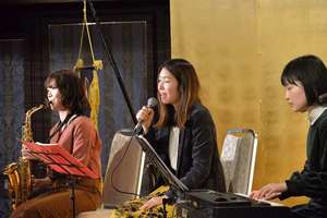 第1部のアトラクションでは、女性トリオ『ひつじ と ごりら』のバンド演奏(ボーカル、サックス、キーボード)を愉しみました。若い女性好みの曲目でしたが、聴いていて心がしっとりと穏やかな気分に浸ることができました。「涙そうそう」から始まり、途中に「北の宿から」の演歌も入り、最後の9曲目の「上を向いて歩こう」は全員で合唱しました。アンコールは、トリオの自信曲である中島みゆきの「糸」を心を込めて歌い上げてくれました。大きな拍手でもって幕となりました。1・2部とも司会は疋田支部役員が務めました。