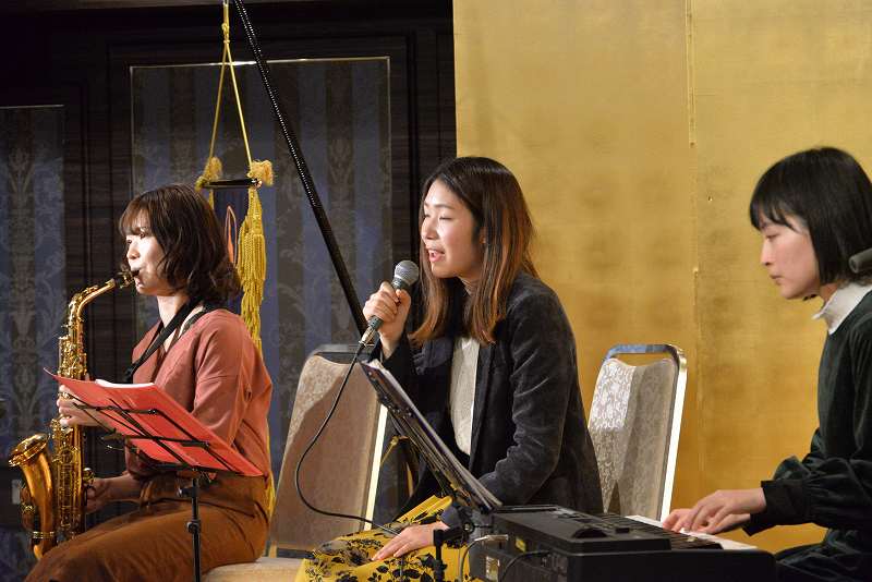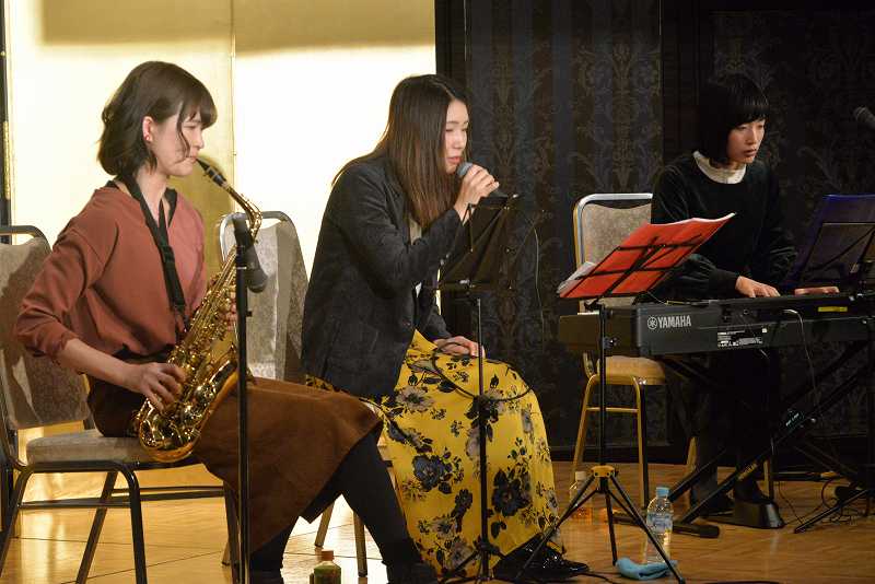 第1部のアトラクションでは、女性トリオ『ひつじ と ごりら』のバンド演奏(ボーカル、サックス、キーボード)を愉しみました。若い女性好みの曲目でしたが、聴いていて心がしっとりと穏やかな気分に浸ることができました。「涙そうそう」から始まり、途中に「北の宿から」の演歌も入り、最後の9曲目の「上を向いて歩こう」は全員で合唱しました。アンコールは、トリオの自信曲である中島みゆきの「糸」を心を込めて歌い上げてくれました。大きな拍手でもって幕となりました。1・2部とも司会は疋田支部役員が務めました。
