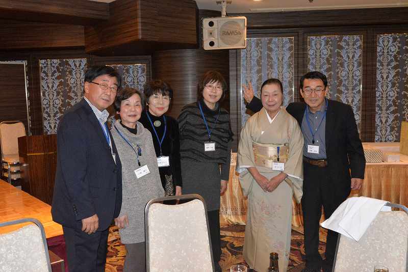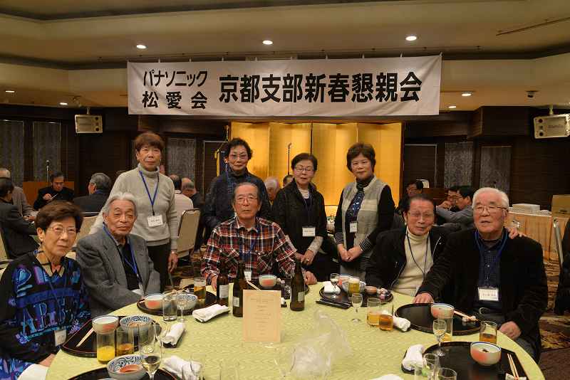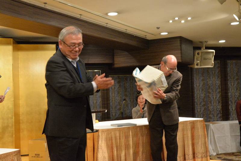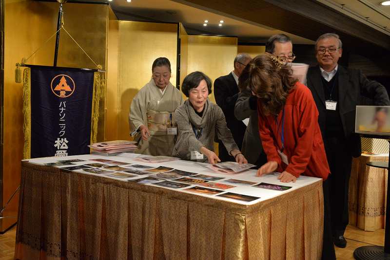 第2部は、永田支部長の年頭の挨拶に続いて、「九州歴史街道・まるごと一周」仮想ウォーク完歩者への記念品授与を行いました。68名のエントリーがあり、58名(うち、健脚コースは23名)が完歩され、最年長の山本喜代一様に代表して記念品を授与しました。会場には38名の該当者が出席されていました。続いて、森岡早苗様(ボウリング同好会会長)の乾杯で、懇親会がスタートし、暫くは新春和洋コース料理と飲み物を愉しんでいただきました。次第に宴が盛り上がって来ますと、席を移動してお互いにお酒を注ぎあってあちこちの席から歓談の声が大きく聞こえてきました。宴会も半ばが過ぎ、いよいよお待ちかねの「大抽選会」が始まります。1等賞「デジタル自動血圧計」、2等賞「ハズキルーペ」から6等賞「クッキーセット」までに加え、「平成賞」として、「乾湿両用ダストバスター」3本がプラスされました。平成最後の年のゴミなどをきれいに掃除してもらおうとの意図で選びました。その他に、パナソニックカレンダーも新たに加わりました。参加賞は、パナソニック100周年ロゴ入りタオルでした。今年も写真同好会から、16名/51点の写真の提供があり、8名に一人3点選んでもらい、額もお渡ししました。日頃松愛会の活動にご支援をいただいている関係先からも特別賞があり、総数75本の賞品が皆さんに当たりました。宴はまだまだたけなわですが、「京都・歩こう会」会長の多湖幹男様の中締めにより宴を閉じました。それでも、まだまだ名残り惜しそうに会場は賑わいを見せていました。
