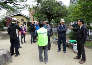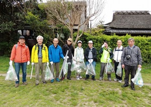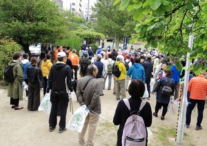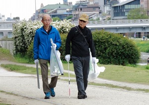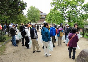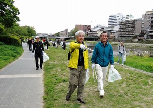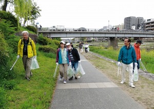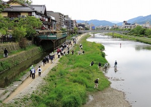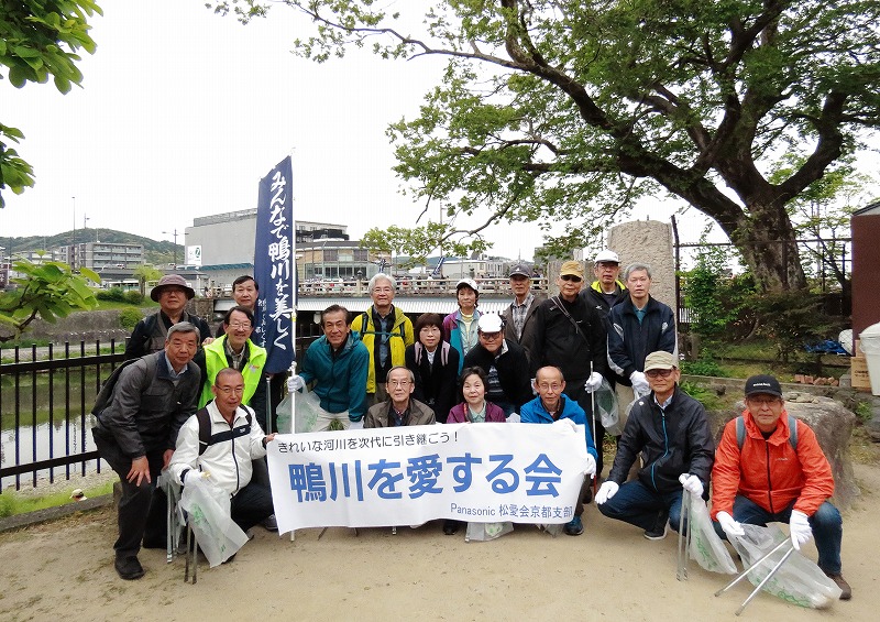 4月29日(月)に、「鴨川クリーンハイク」を実施しました。これは、地域住民によって、鴨川を美しくするために、行政機関と相互に連携し、河川美化と環境保全の輪の広がりを目的として結成されたボランティア活動団体”鴨川を美しくする会”の「京都市民の憩いの場である鴨川の川辺を歩いて清掃する活動を通じ、美しい川・鴨川を取り戻そう」との呼び掛けの趣旨に賛同し、パナソニック松愛会京都支部の社会貢献活動の一環として鴨川美化活動に参加しているものです。ゴールデンウィーク3日目の祝日にもかかわらず、19名が参加しました。当日は天気予報で雨模様が予想されていましたが、寒くも暑くもなく、絶好のクリーンハイク日和でした。全体では家族連れ、企業や大学のグループなど約250名が清掃活動に取り組みました。