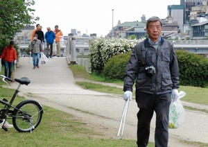 10時前に、五条大橋の西北たもとにある鴨川右岸の五条公園に集合し、軍手・ごみバサミ・ごみ袋の3点セットを受け取り、”鴨川を美しくする会”事務局からの挨拶と諸注意を聞いた後、同公園にて鴨川をバックに参加者全員で記念撮影です。その後、左岸(東側)に移動して上流の丸太町橋までの約2.5Kmの川沿いや河川敷を中心に清掃を行いました。