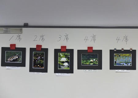 続いて恒例の互選会の開催です。 今回の撮影会作品は枚方市山田池公園で行われた撮影会時に撮影されたものです。 池に遊ぶかわいいコガモや菖蒲等を撮影した力作が出品されました。自由作品は遠くへ出掛けたり早朝に出かけて撮影した季節感溢れる作品が出品され、3席に4作品が入賞するという稀にみる激戦となり盛り上がりました。