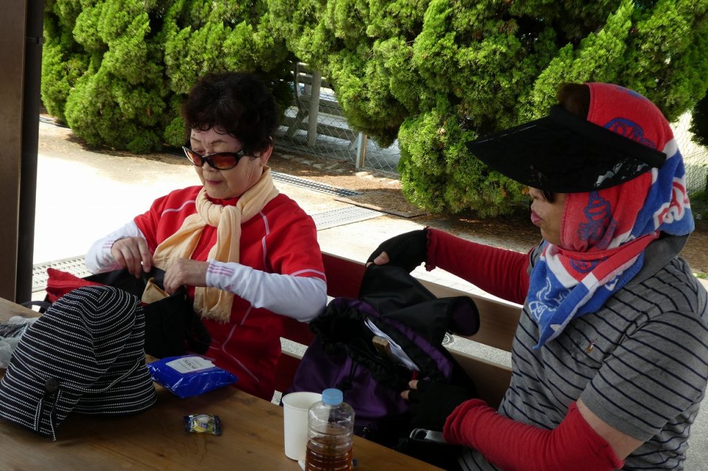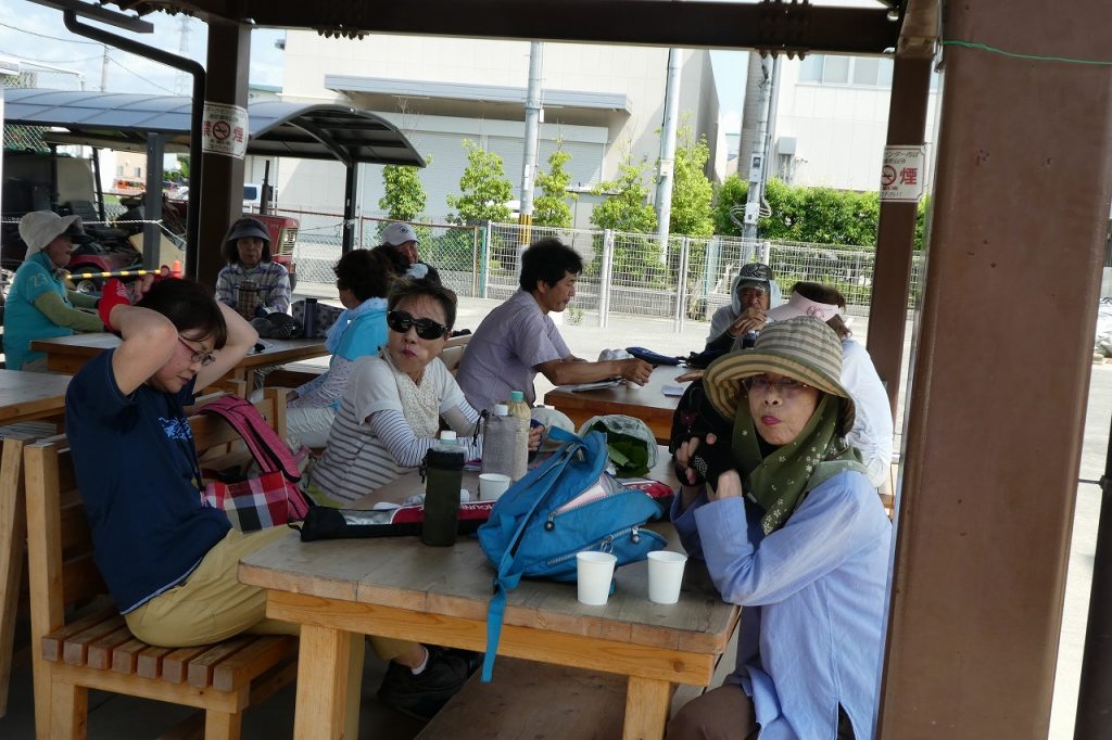 - 汗をふきふき 大石さん 水分補給の石野さん、三宅さん