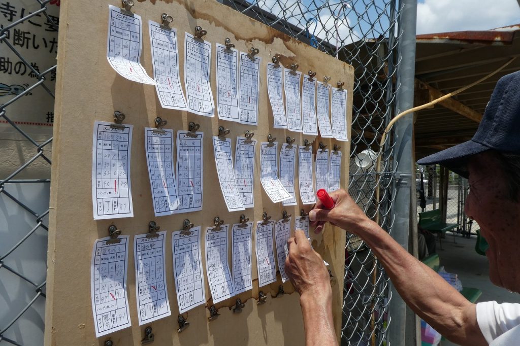 - スコアカ-ドを掲示板に張付ける佐貫会長、