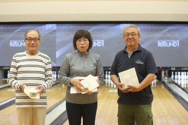 結果は、一位には美濃井さんが559点で、常連組の遠藤さん、松井さんが少し順位を落して、逆に谷口さんが頑張って二位に入られました。三位には寺田さんです。ハイゲームは美濃井さんが取得されました。女性の順位は、一位浜崎さん、二位に今田さん、三位に森岡さんが活躍されています。