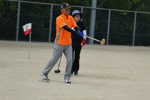 当日の天気は、朝から太陽が眩しく照り付けていました。グランドは、マズマズのコンディションでしたが、皆さんは、初めてのコース設定に苦戦されていました。1年ぶりの友との再会を分かち合い、一緒に挑戦し、笑顔でプレ-し、大変元気に楽しんで頂きました。