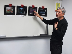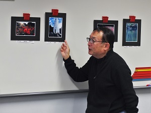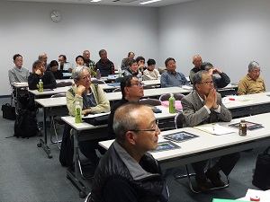 11月14日(木)長岡京バンビオ4階学習室1に於いて会員25名が参加して11月例会を開催しました。今月例会には10月撮影旅行に外部から特別参加いただいた西京デジカメクラブの方々と同好会会員の知人西川さんにも参加頂きました。