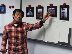続いて互選会です。今月は10月の撮影旅行が対象の「撮影会の部」と、冷え込みが増した早朝、朝もや・夕日にススキ・夕焼け空等季節感あふれた一瞬をとらえた「自由作品の部」と、いづれも力作が出揃いました。 今月のアドバイザ-は八木さん、小和泉さん、浦上さんにお願いしました。互選会入選作品の紹介・寸評からスタ-トし、続いて各会員も作品を紹介してその作品にもコメンタ-からアドバイスを受けました。互選会は「勉強の場」です。一同熱心に聴き入りました。