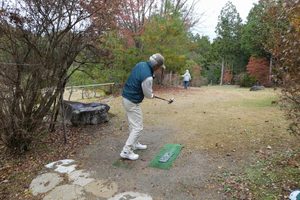 集合時、天候は曇り空の中、秋季日帰遠征親睦大会を決行しました。現地までは、亀岡小型交通の送迎バスで行きました。競技は時折り小雨が降る寒い中でのプレ-でした。他の団体さんが大勢いる中、男女2人ずつ4人を1チームとし5組に分け、8ホ-ル×7ラウンドで競技を行いました。午前は4ラウンド、途中、休憩・昼食を挿み、午後から3ラウンドを行いました。各リ-ダ-の指示に従いトラブルもなく無事にラウンドを終了することが出来ました。
