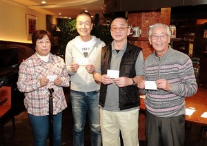 表彰式では、優勝、準優勝、3位、BB賞、参加賞が森岡会長から手渡されました。まだまだ賑わいの中でありましたが、会長の締めでお開きとなりました。今後とも楽しみながらプレーされ、これからも、会員方々の健康増進のために定例会を続けたいとおもいます。
