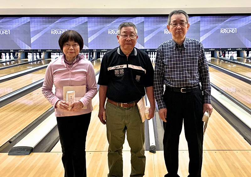 成績結果は、上位には、やはり常連組が実力を発揮されています。1位には、美濃井さんが569点、2位には永田(博)さん、3位には福田さんが入られました。ハイゲームは田中さんの201点で獲得されました。女性の上位では1位に浜崎さんが494点で、2位に森岡さん、3位に松浦さんと健闘されています。今回の例会で、3Gゲームスクラッチ、トータル500点UPを美濃井さん、永田(博)さん、福田さん、関口さん、松本さん、田中さん、寺田さん、松井さんの8名の方が達成されました。