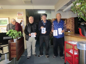 2020.03.13 同好会, 麻雀同好会 京都支部麻雀同好会 年間成績表(2019年度) ☆ 京都支部麻雀同好会 年間成績表 ☆ (2018年度計) (敬称略) 2018年度年間成績 優勝 2位 3位 4位 5位 6位 7位 近藤 正昭 大久保弘幸 村上紘一郎 前川 訓広 佐野 利典 古川 政男 金山 文男 8位 9位 10位 15位 20位 藤木 加巳 河原林育穂 佐々井 仁 白樫 勝 上位入賞者の3人左より 第2位 村上さん 優勝 近藤さん 第3位 大久保さん 飛び賞の皆さん 対戦風景 ☆ 京都支部麻雀同好会 年間成績表 ☆ (2019年度計) 杉村 記 月例回数 実施日 参加人員 優勝 2位 3位 4位 5位 6位 7位 BB 554回 4月11日 17名 杉村 光照 井戸 松雄 安原 昭治 中塚 三郎 大久保弘幸 近藤 正昭 金山 文男 藤木 加巳 555回 4月25日 17名 中塚 三郎 前川 訓広 原田 幸彦 近藤 正昭 杉村 光照 佐野 利典 安原 昭治 村上紘一郎 556回 5月9日 16名 井戸 松雄 安原 昭治 原田 幸彦 前川 訓広 近藤 正昭 杉村 光照 佐々井 仁 卯余野しづ 懇親会 5月16日 17名 優勝 2位 3位 4位 5位 6位 7位 白樫 勝 藤木 加巳 佐野 利典 卯余野しづ 原田 幸彦 河原林育穂 杉村 光照 8位 9位 10位 BB 安原 昭治 堀池 裕弘 前川 訓広 佐々井 仁 上位入賞者の3人左より 第2位 藤木さん 優勝 白樫さん 第3位 佐野さん 飛び賞の皆さん 対戦風景 月例回数 実施日 参加人員 優勝 2位 3位 4位 5位 6位 7位 BB 557回 5月23日 18名 佐野 利典 藤木 加巳 安原 昭治 白樫 勝 大久保弘幸 河原林育穂 深田 慧 堀池 裕弘 558回 6月13日 19名 前川 訓広 中塚 三郎 金山 文男 佐野 利典 白樫 勝 卯余野しづ 森野 道夫 大久保弘幸 559回 6月27日 18名 古川 政男 河原林育穂 佐々井 仁 大久保弘幸 村上紘一郎 佐野 利典 杉村 光照 前川 訓広 560回 7月11日 18名 森野 道夫 原田 幸彦 白樫 勝 金山 文男 卯余野しづ 藤木 加巳 佐野 利典 中塚 三郎 561回 7月25日 20名 村上紘一郎 近藤 正昭 河原林育穂 安原 昭治 深田 慧 大久保弘幸 堀池 裕弘 原田 幸彦 562回 8月8日 17名 前川 訓広 金山 文男 藤木 加巳 近藤 正昭 中塚 三郎 河原林育穂 安原 昭治 村上紘一郎 563回 8月22日 19名 河原林育穂 白樫 勝 前川 訓広 井戸 松雄 古川 政男 藤木 加巳 村上紘一郎 安原 昭治 564回 9月12日 17名 前川 訓広 佐野 利典 卯余野しづ 杉村 光照 近藤 正昭 村上紘一郎 金山 文男 河原林育穂 565回 9月26日 17名 堀池 裕弘 佐々井 仁 原田 幸彦 中塚 三郎 杉村 光照 深田 慧 佐野 利典 安原 昭治 月例回数 実施日 参加人員 優勝 2位 3位 4位 5位 6位 7位 BB 566回 10月10日 20名 金山 文男 古川 政男 井戸 松雄 卯余野しづ 藤木 加巳 佐野 利典 村上紘一郎 近藤 正昭 567回 10月24日 21名 原田 幸彦 近藤 正昭 中塚 三郎 前川 訓広 金山 文男 藤木 加巳 深田 彗 森野 道夫 568回 11月14日 17名 近藤 正昭 大久保弘幸 古川 政男 佐野 利典 金山 文男 佐々井 仁 杉村 光照 藤木 加巳 懇親会 11月21日 18名 優勝 2位 3位 4位 5位 6位 7位 村上紘一郎 井戸 松雄 河原林育穂 藤木 加巳 前川 訓広 杉村 光照 森野 道夫 8位 9位 10位 BB 近藤 正昭 安原 昭治 金山 文男 佐野 利典 飛び賞の皆様 右側河原林さん・村上さん・井戸さん 対戦風景 月例回数 実施日 参加人員 優勝 2位 3位 4位 5位 6位 7位 BB 569回 11月28日 20名 藤木 加巳 河原林育穂 深田 慧 金山 文男 白樫 勝 佐野 利典 中塚 三郎 井戸 松雄 570回 12月12日 20名 白樫 勝 井戸 松雄 堀池 裕弘 中塚 三郎 藤木 加巳 佐野 利典 日浦 義尭 近藤 正昭 571回 12月26日 20名 日浦 義尭 前川 訓広 藤木 加巳 佐野 利典 河原林育穂 井戸 松雄 近藤 正昭 中塚 三郎 572回 1月9日 17名 前川 訓広 金山文男 杉村 光照 井戸 松雄 卯余野しづ 河原林育穂 村上紘一郎 佐々井 仁 573回 1月23日 21名 深田 慧 金山 文男 中塚 三郎 杉村 光照 古川 政男 藤木 加巳 井戸 松雄 堀池 裕弘 574回 2月13日 18名 村上紘一郎 金山 文男 古川 政男 佐野 利典 堀池 裕弘 白樫 勝 大久保弘幸 河原林育穂 575回 2月27日 17名 井戸 松雄 金山 文男 前川 訓広 近藤 正昭 森野 道夫 安原 昭治 古川 政男 杉村 光照 576回 3月12日 14名 白樫 勝 日浦 義尭 佐野 利典 藤木 加巳 村上紘一郎 中塚 三郎 安原 昭治 古川 政男 577回 3月26日 投稿者: cmj01sugimura 同好会, 麻雀同好会 京都歩こう会(中止)「第285回 近江商人の郷・近江…前の記事 第61回パソコン同好会を実施しました。次の記事