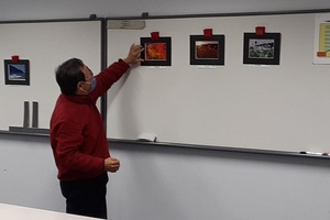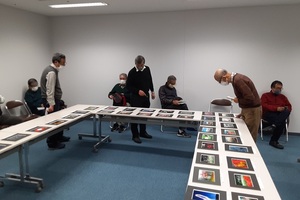 今月の互選会は、各人の自由作品を3枚づつ机上に並べて、密を避けるため数人づつのグル-プに別れて閲覧・投票しました。入選作品及び各人の作品について八木さん・浦上さんから寸評・アドバイスを頂きました。