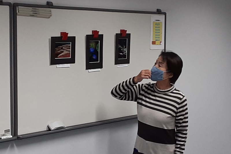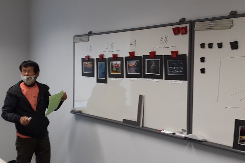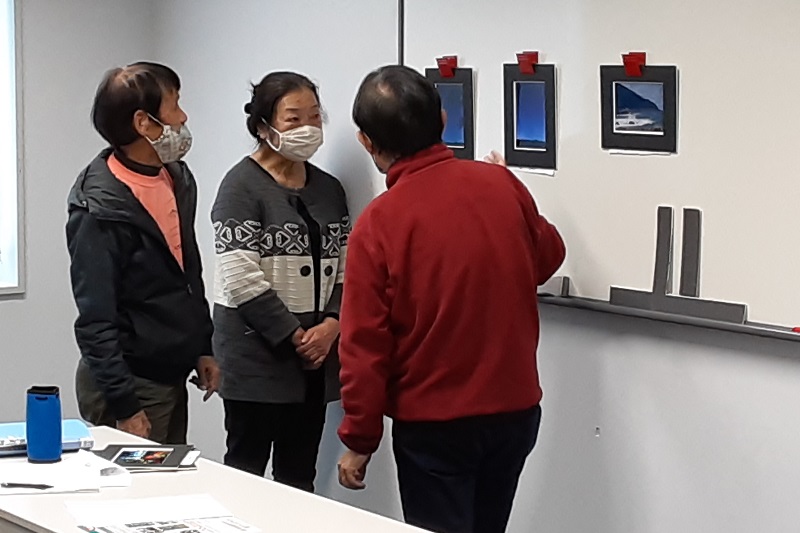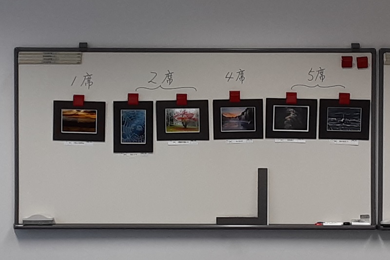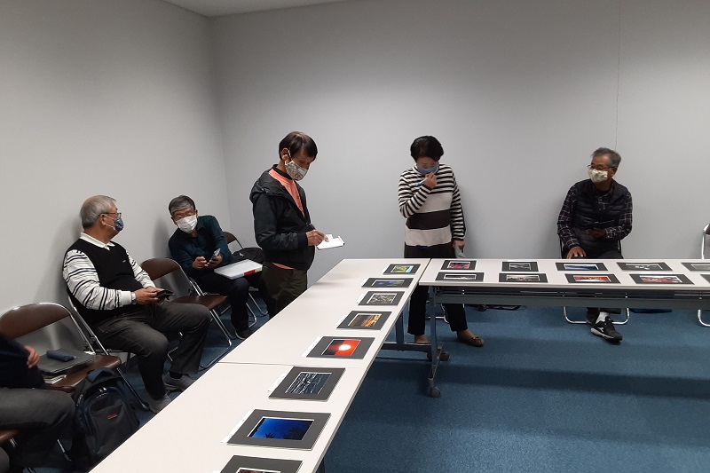今月の互選会は、各人の自由作品を3枚づつ机上に並べて、密を避けるため数人づつのグル-プに別れて閲覧・投票しました。入選作品及び各人の作品について八木さん・浦上さんから寸評・アドバイスを頂きました。