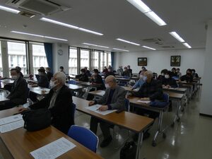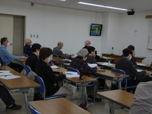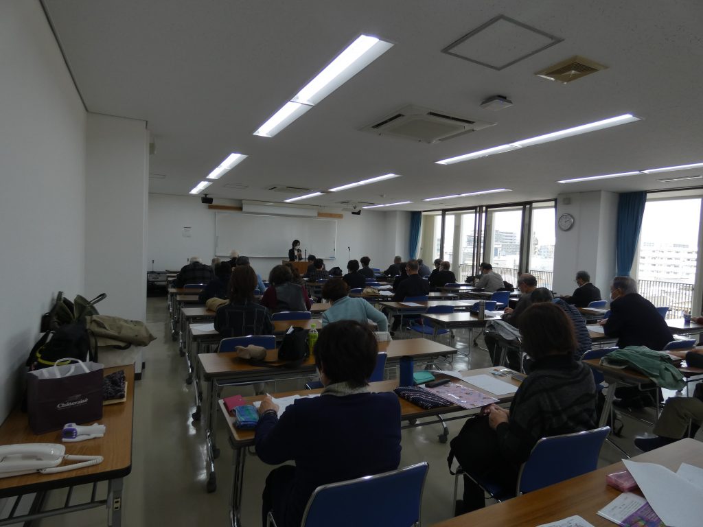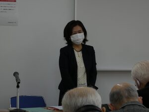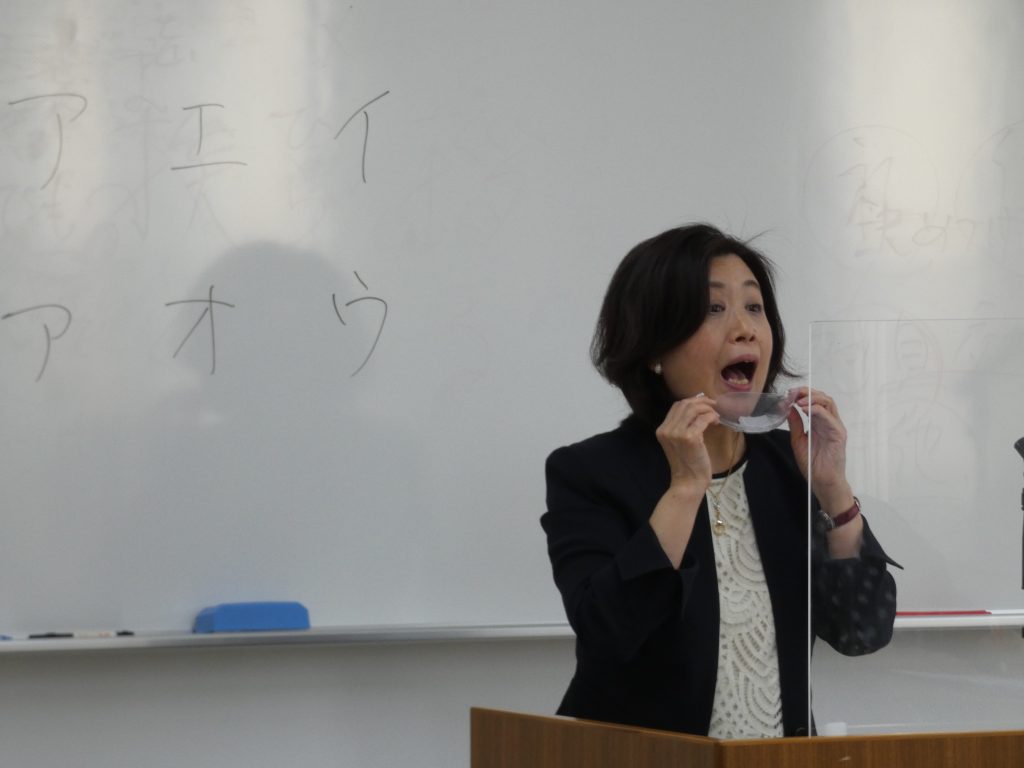 次に、「ボイストレーニング」です。コロナ禍の状況下ですので、余り大きな声を出しては出来ませんでしたが、「人は口から老いる」という言葉には実感が伴い、口や舌の筋肉を鍛えることが、今の私達には大変大事であると再認識しました。老人に多い「誤嚥性肺炎」の防止にも役立つ、「レロレロ体操」(舌)、「パラピリ体操」(唇と舌)、「アイウベ体操」(のど、あご)、「パタカラ体操」(唇、舌、のど)を実際にやって見ました。お風呂場でやると、より効果が上るそうです。他にも、「付け足し言葉」、「早口言葉」も紹介され、口、唇、舌をしっかりと動かして愉しく元気よく喋ることの重要性を訴えられました。最後に、「腹式呼吸」(鼻から息を吸って口から出す)の極意(吸:3、止:2、吐:10)を授けていただきました。2時間半の講演時間があっという間に終わり、皆さん笑顔で散会しました。