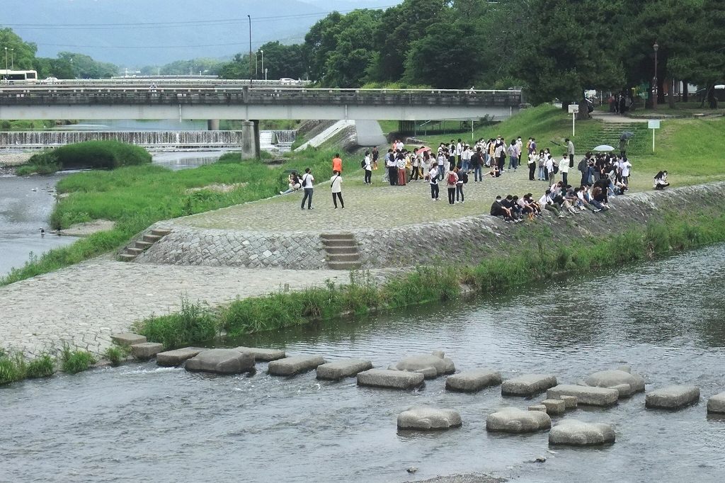 - 賀茂川と高野川の合流点、若者が密集しています、大変危険!