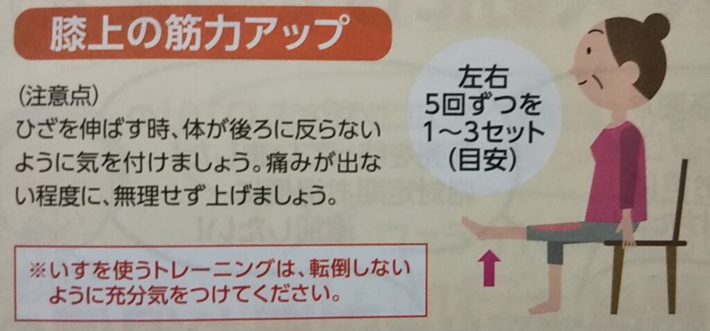 太ももの前側の筋肉を鍛える事で膝が伸び、転倒防止や血流アップ、冷え症・むくみの改善に役立ちます。