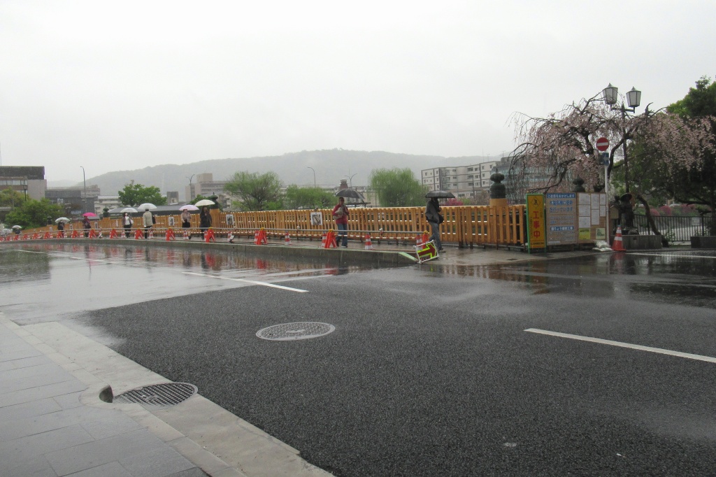 - 雨の三条大橋、現在 木製の欄干架け替え工事中!