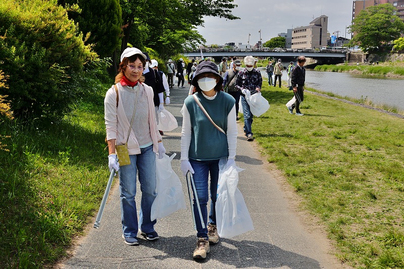 当日は、雨模様の予報が出ていましたが、五条大橋の近くの五条公園に10時に集合し、過去最多の26名の皆様にご参加いただき、五条大橋から丸太町橋までの東岸約2.6キロを清掃しながら歩きました。