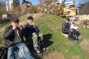 - 京都屈指の繁華街、先斗町公園でのお早い昼食タイムで笑顔!