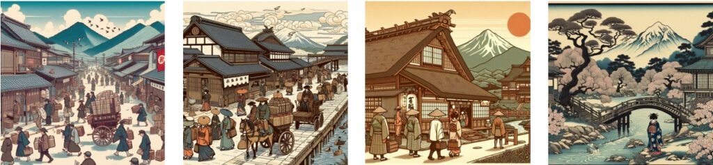 東海道五十三次は、歌川広重の浮世絵シリーズで非常に有名です。広重の作品は、日本国内のみならず海外でも高く評価され、江戸時代の風景や文化を伝える重要な資料となっています。東海道の宿場町には、旅人の休憩や宿泊を提供する施設が整備されており、商人、武士、僧侶、一般庶民などさまざまな人々が行き交いました。