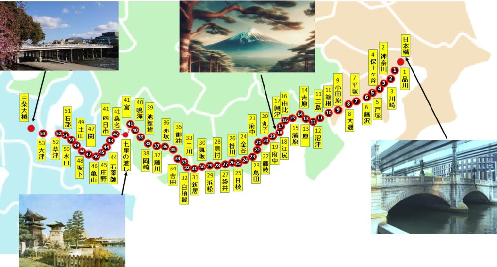 東海道(とうかいどう)は、江戸時代の日本における五街道の一つで、江戸(現在の東京)と京都を結ぶ主要な街道です。全長は約495キロメートルで、五街道の中でも特に重要な路線とされていました。東海道は、江戸幕府が設けた宿場町(宿駅)が53か所あり、これを「東海道五十三次(とうかいどうごじゅうさんつぎ)」と呼びます。