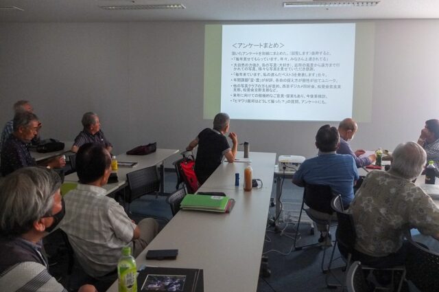 6月13日(木)長岡京市バンビオ4階学習室1に於いて会員19名が出席して開催しました。北村会長の挨拶でスタ-トし、まず恒例の互選会を行いました。その後6月及び7月度撮影会について撮影会担当を中心に検討しました。第9回写真展のまとめ、会計報告はプロジェクターを使用して近藤リーダーから行いました。最後に諸連絡の後閉会しました。今月は例会閉会後、場所を移して有志による第9回写真展の打ち上げを行い懇親を深めました。