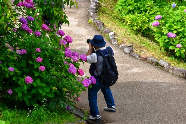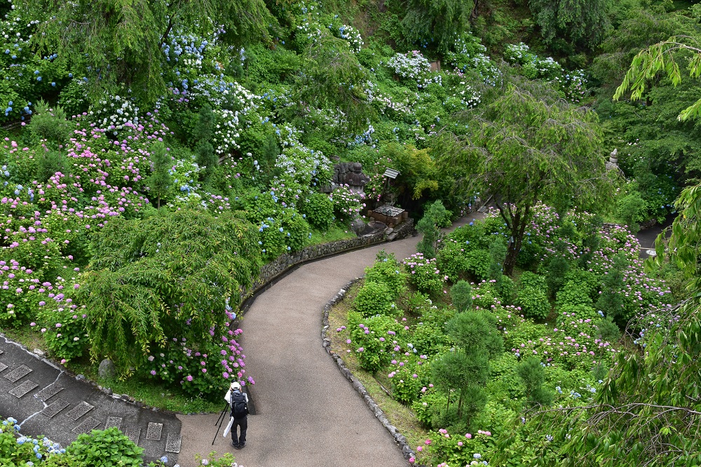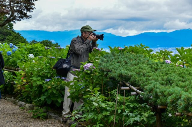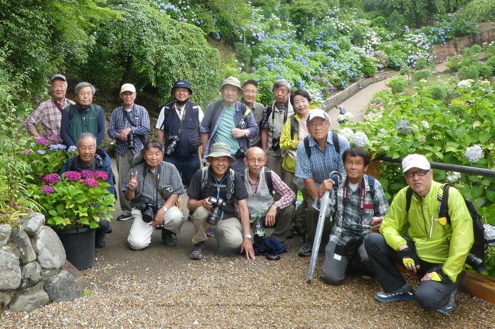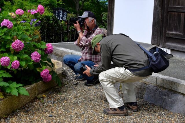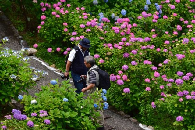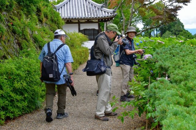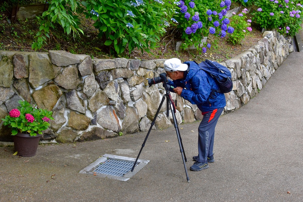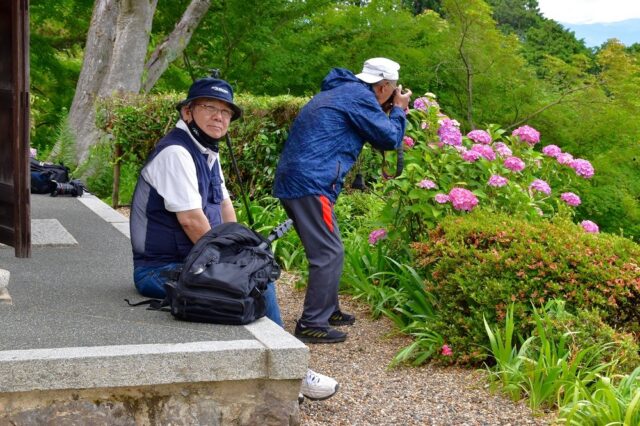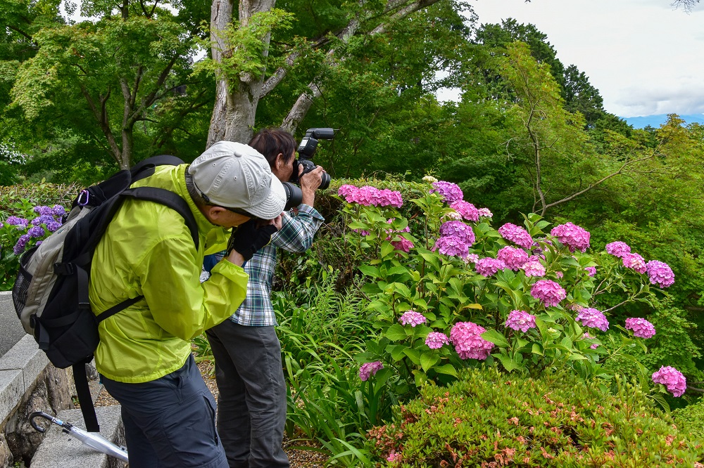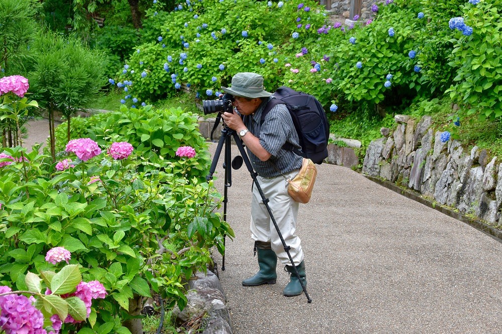 6月18日(火)に京都・西山西国第二十番札所善峯寺で6月度撮影会を開催しました。当日は朝から天気予報通りの激しい雨模様で集合時間を午前9時から午後2時に変更し、15名で集合写真を撮影、撮影会担当者からの諸連絡の後、山麓に広がる境内に散開して雨に濡れた満開の紫陽花を狙って撮影を開始しました。7月度の互選会が楽しみです。
