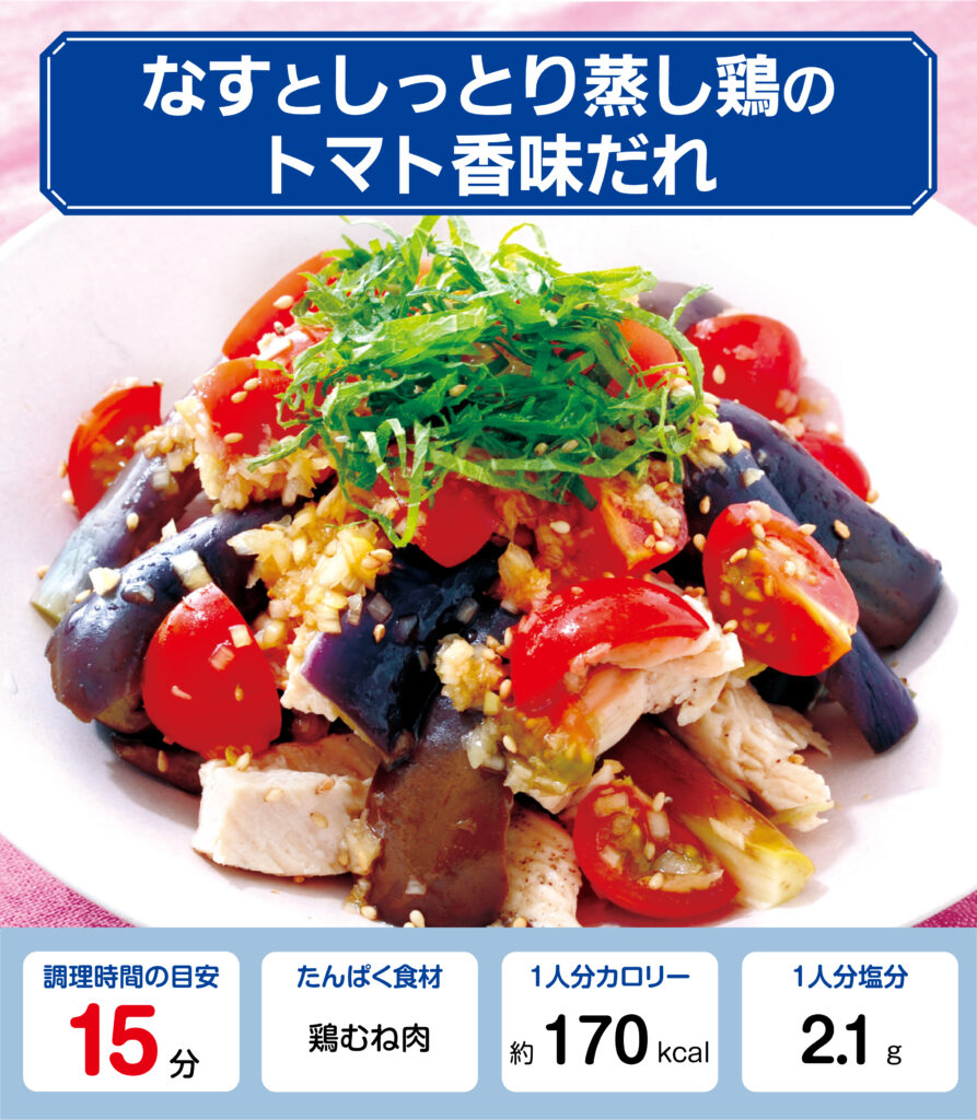 ③器になすと鶏肉を盛り、①をかけ、大葉と白ごまをのせる。