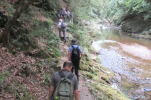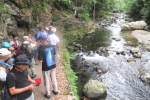 - 川沿いの岩場を歩く為、1分間ストレッチ体操を実施、さー出発!