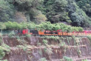 - 保津川沿いを走る、亀岡行トロッコ列車を急ぎ撮影パチリ!